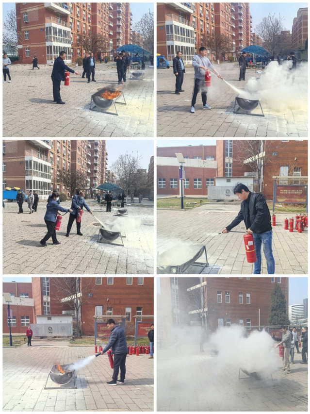 下午1时,灭火器实操演练在八区停车场北侧展开。在物业秩序部点燃火桶后,师生与物业员工依次进行灭火器及灭火毯的实际操作练习,亲身体验初起火灾的扑救过程。